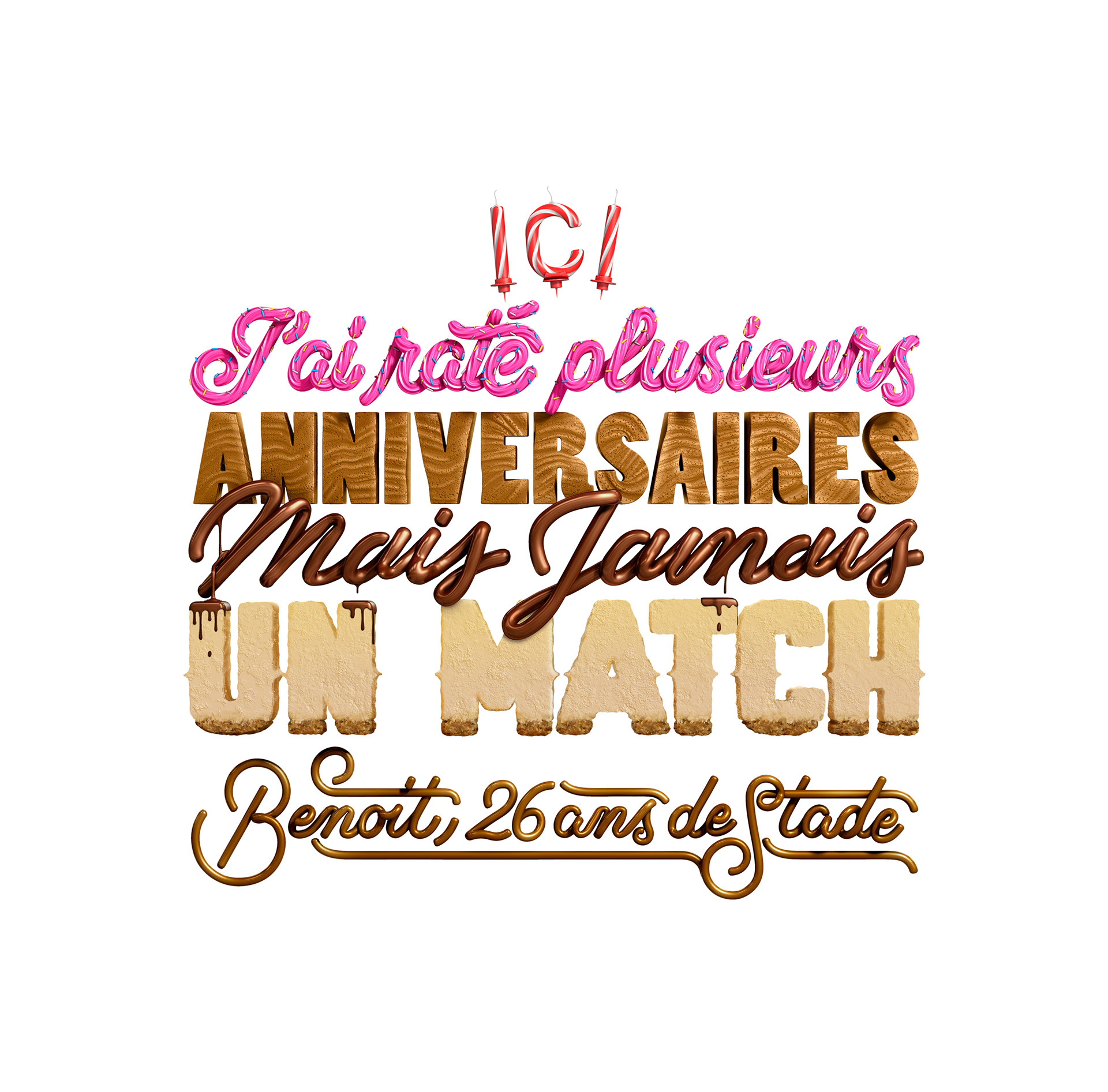 Commisioned works for the 2015 Winamax print campaign (France). Agent: Créasenso Agency: Havas Art director: Omar Mabrouk Crátive director: Eric Colin 3D ("Aniversaires" print): Javier Ramos Typography/lettering: Wete
